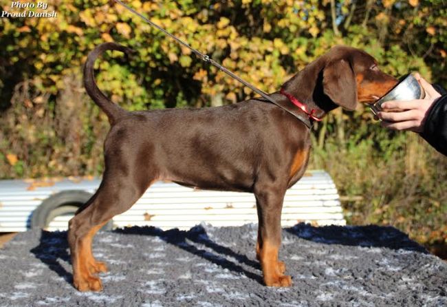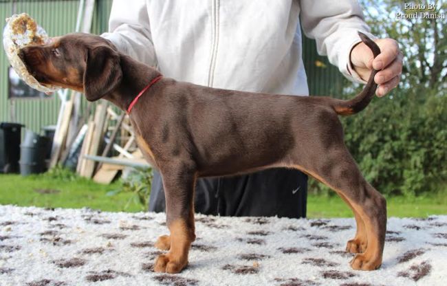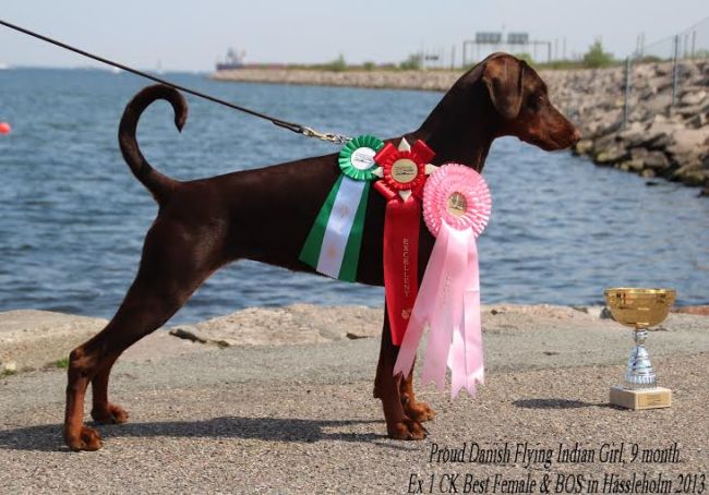 09-12-2012 DKK Kreds 10 Christmas show VP 1, BOS Baby 09-02-2013 Fredericia DKK International Cacib Show Puppy Class Females: VP 1 BOB Baby 23th marts 2013 Malmö International Cacib show. VP 1 Honor Price - BOB Pup - BIS 4 of all breeds 28th April 2013 in Gribskov Puppy class Promissing 04th May 2013 DKK International Cacib show in Roskilde VP 1 BOB Pup, BIS 2 (71 pups of all breeds) 05th May 2013 DKK International Cacib show in Roskilde VP 1 BOB Pup 09-05-2013 DKK Kreds 1 Bakkeskue VP 1, Best Pup and BOB 18-05-2013 Hässleholm National CAC show in Sweden Junior class Ex 1, ck and BOS 19-05-2013 Altona Dobermann CAC show in Hamburg Germany Junior class brown females SG 2 (Ex 2) and VDH CH. Res. 02-06-2013 Neumünster Cacib show Junior class brown females SG 2 (Ex 2) & VDH CH: Res.