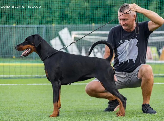 Titles IDC Junior World Winner 2023 (Slovakia) Croatian Junior Club Winner 2023 Croatan Junior Champion 2023 Croatian Winter Classic Winner 2023 Croatian Champion 2024 Austria Winner 2024 Europa Dobermann Trophy Winner 2024 Health results HD-A (Croatia) HD-A (DV- Germany) vWd- clear DCM - clear DM - clear spondylosis deformans free Work results Croatian breeding test FCI BH/VT ZTP V1B - judge: Becht T. Show results Golden Dobermann Show Slovakia 2023 - Junior Winner, Best female, B O S, judges: I.Rada, G.Ehrenreich) IDC 2023 Slovakia - IDC WORLD JUNIOR WINNER, judges: T. Becht, R.Killmaier, B.Zanieri, G.Ridarčikova) Croatian Club Show 2023 - Croatian Junior Club Winner 2023, B O B, judge: S.Cujan (CRO) Croatian Winter Classic 2023 - Croatian Junior Winner, Best Junior, B O B, judge: E. Vadocz (HU) CAC Dugo Selo, Croatia 2024 - CAC, B O B, judge: S.Strniša (SLO) CACIB Varaždin, Croatia 2024 - CAC, CACIB, B O B, judge: Z. Buffia (HU) Europa Doberman Trophy 2024, Austria - Austria Winner 2024, Europa Dobermann Trophy Winner 2024, B O S, judge: Triona Ni She (IRL)