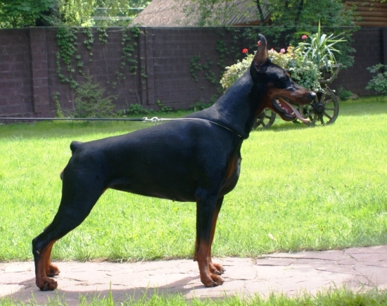 Titles INTERCHAMPION Class Winner on Euro Dog Show 2010 Champion of Russian Dobermann-Club Champion of Russia Champion of Slovenia Champion of Belorusia Champion of RKF Champion of Romania Champion of Croatia Champion of Bilgaria Championof Georgia Champion of Moldova Grand Champion of Russia Grand Champion of Belorusia Grand Champion of Bilgaria Grand Champion of Georgia Grand Champion of Romania Champion of Balkan Young Champion of EURASIA Young Champion of Russia Young Champion of Russian Dobermann-Club Young Dobermann-Club Winner Multi-BOB, 5xCACIB, 2xBIG, 6xBIS Health CEA-RD-PHTVL/PHPV-Katarakt-PRA-free, Cardio – free (EKG, ECHO, Doppler - free, Holter 24 hours- free.) vWD-clear HD-A Work ZTP V1A BH, IPO-1