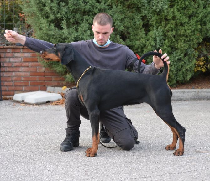 Titles JUNIOR CHAMPION OF BULGARIA CHAMPION OF MONTENEGRO CHAMPION OF BOSNIA ERZEGOVINA Show results EUROPEAN ALL STARS GRAND PRIX Dobermann Breeders Day 30.06.2019 Backa Palanka (SRB) Judges: Jelena Pipira, (Livonija); Natalia Solovyova (de Grande Vinko) & Simon Baranja del Nasi (Del Nasi VP1 – Baby Class Female Black, 4 months HDK SPECIALITY SHOW Kincsem Dobermann Derby Club of Hungary – 05.09.2019 Judges: Erika Szokol (HU), Istvan Rada (HU), Andras Korozs (HU) EXC 5 – Puppy Class Female Black, 6 months IDC – WORLD CHAMPIONSHIP HU – 07.09.2019 Judges: Hans Wiblishauser (D), Thomas Becht (D), Norbert Daube (D), Attilio Polifrone (I), Tamas Dohoczki (H) EXC – Puppy Class Female Black, 6 months INTERNATIONAL DOG SHOW VERONA - ENCI WINNER 2019 11/12/2019 - Judge: Bispo Pedro Ivo Santos (PT) EXC2 – V/WINNER Junior Class Female Black, 10 months RADUNO NAZIONALE – ENCI WINNER VERONA 12/12/2019 - Judge: Hudono Andi (RI) EXC 2 – V/WINNER Junior Class Female Black, 10 months “3’ INTERNATIONAL DOG SHOW – C.A.C.I.B. – SOFIA (BG)” Date: 15/02/2020 Judge: HASSI ASSENMACHER (D) EXC 2 – V/Winner Junior Class Female Black Date: 16/02/2020 Judge: ANTOAN HLEBAROV(BG) EXC 1 – Winner Junior Class Female Black, Junior Best of Breed, JBOB “ 22’ TROFEO PIETRO CALIANDRO – AIAD - PISTOIA” Date: 23/02/2020 EXC 3 - Junior Class Black Female “CACIB INTERNATIONAL DOG SHOW MONTENEGRO” 2020 31/10/2020 Judge: NIKOLA DUMEZIC (MNE) EXC1 - Winner in Intermedia Class Black Female, CAC, 01/11/2020 Judge: ANDRIC SLAVOLJUB (SRB) EXC1 - Winner in Intermedia Class Black Female, CAC “ CACIB INTERNATIONAL DOG SHOW BOSNIA ERZEGOVINA” 2020 13/11/2020 CAC 1 = Judge: IGOR SELIMOVIC (HR) CACIB 1= Judge: JADRANKA SMOJVER SELIMOVIC (HR) 14/11/2020 CAC 2 = Judge: SANJA VRETENICIC (MNE) CACIB 2 = Judge: IVAN JUKIC (BIH) CAC 1- EXC1 Winner in Intermedia Class, Black Female, CAC CACIB 1 – EXC 1 – Winner in INtermedia Class, Black Female, CAC CAC 1- EXC1 Winner in Intermedia Class, Black Female, CAC CACIB 2 – EXC 1 – Winner in INtermedia Class, Black Female, CAC Work results BH – VT Health results HD - A (D) vWD Clear DCM – Free (10/2020) Doppler Free PHVTL/PHPV Free