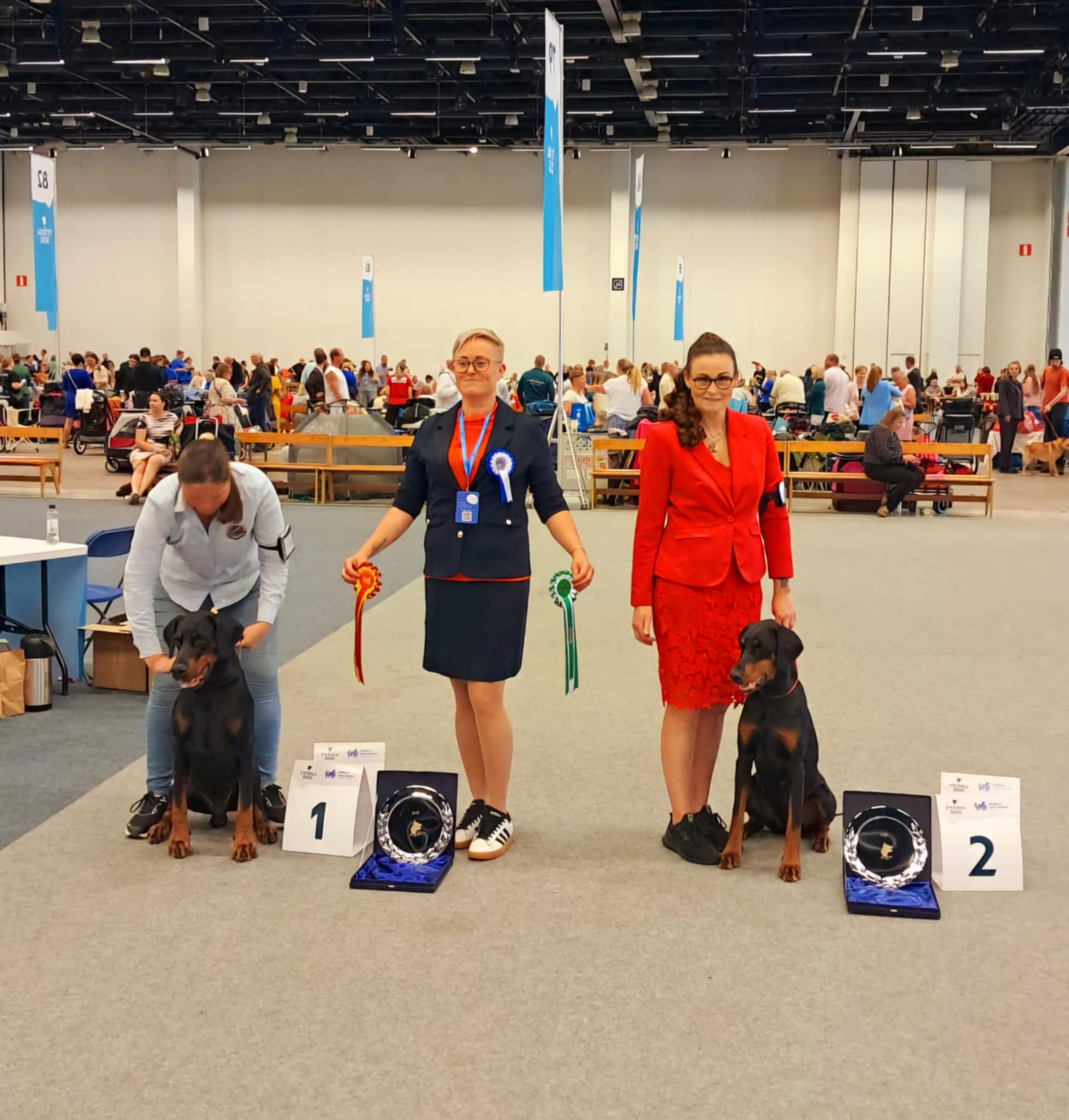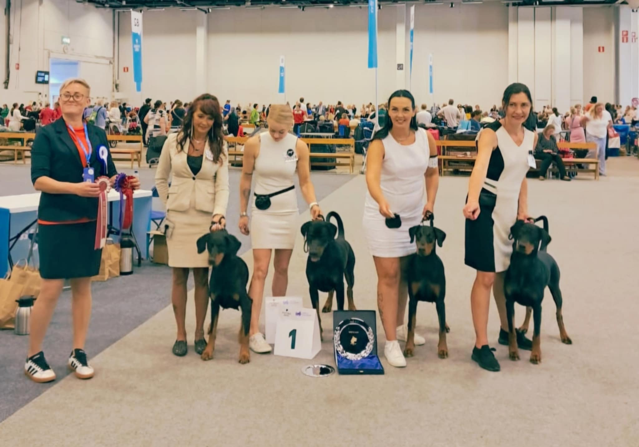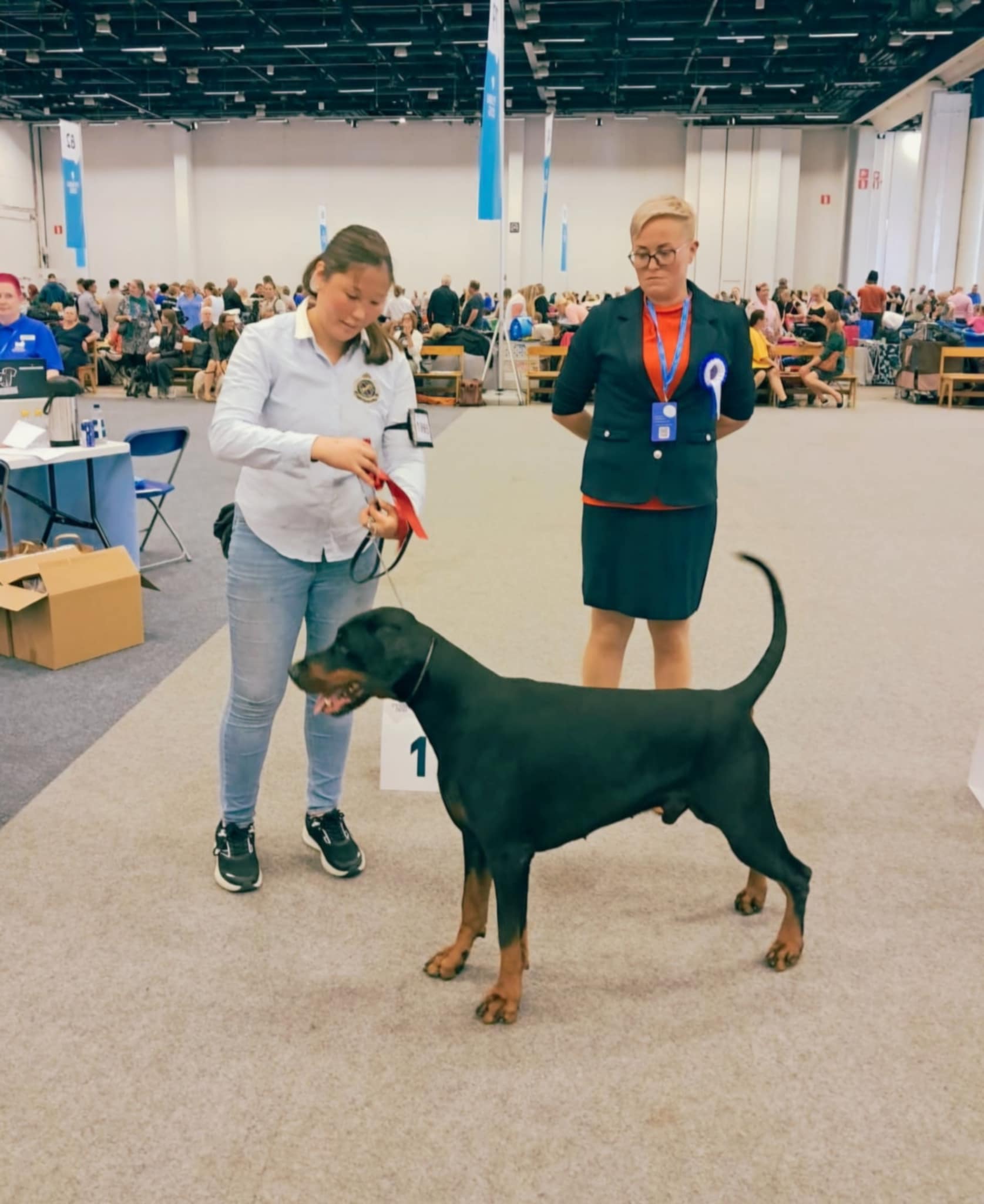 (This dog has only one p1, this is why he is disqualified. Could size dog, excellent head. Clear marks. Dark eyes, correct ears, good neck. Normal angulation. Strong topline, normal angulations behind. Good position of tail. Good temperament. Typical mover.)