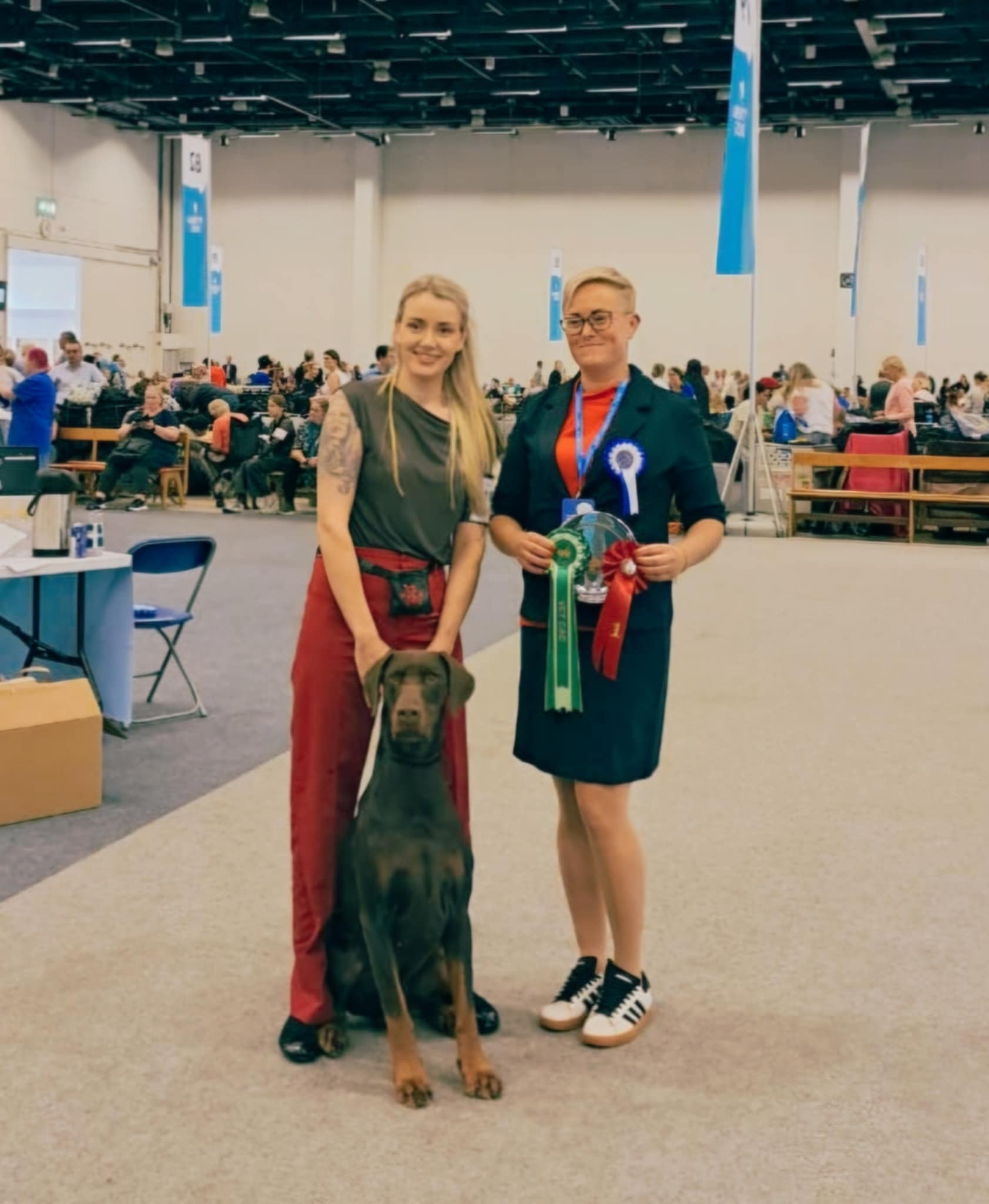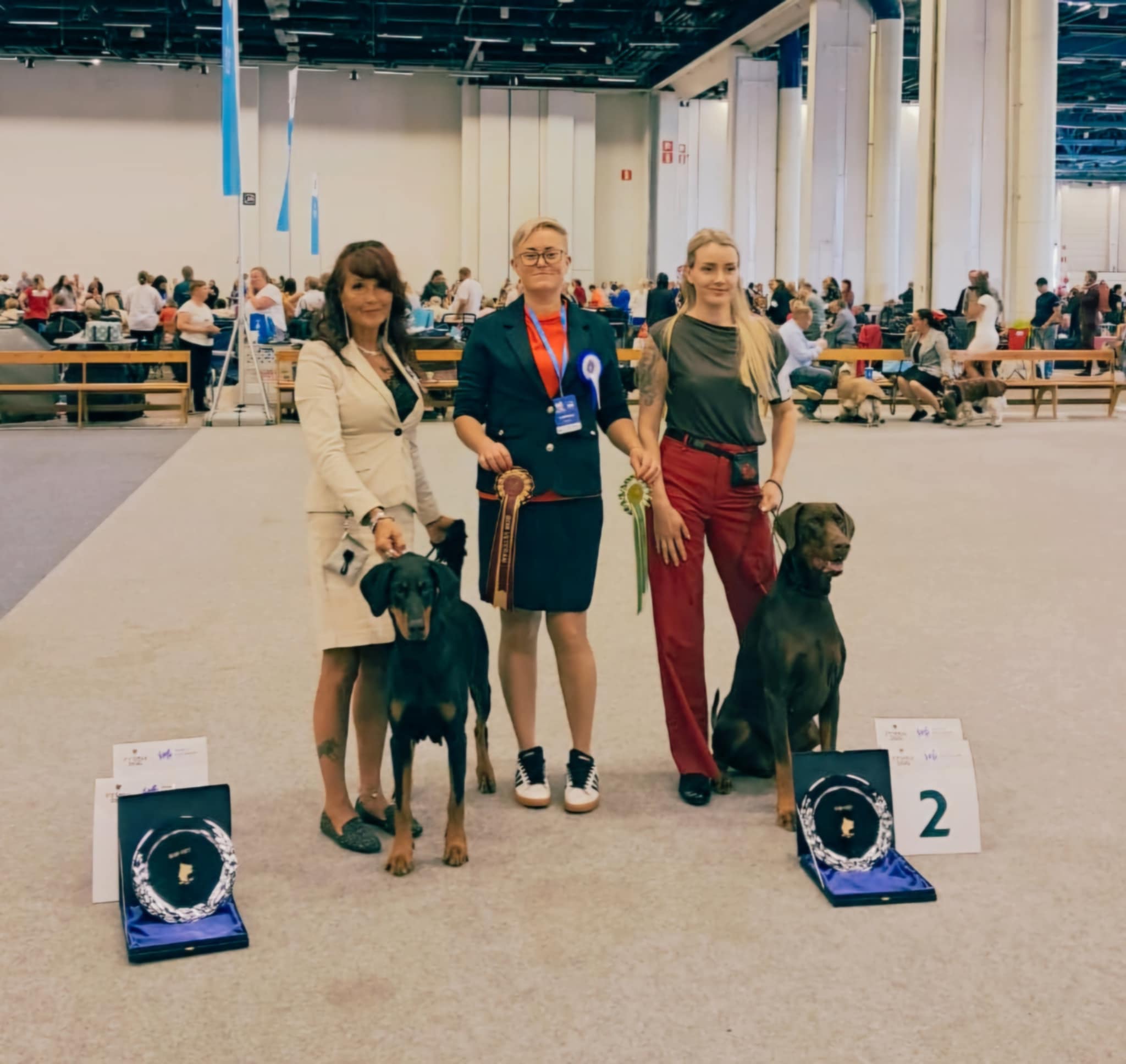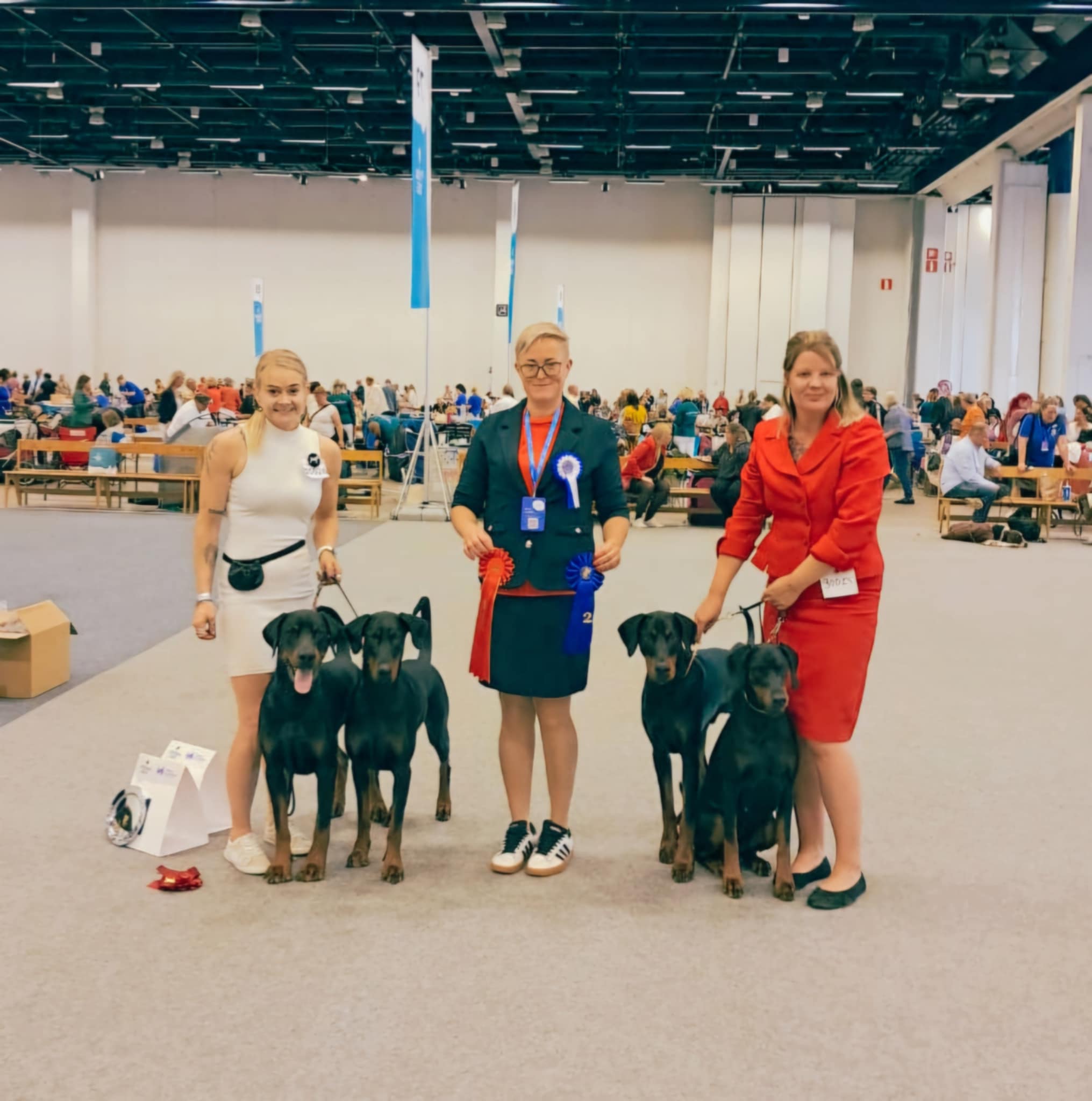(This dog has only one p1, this is why he is disqualified. Could size dog, excellent head. Clear marks. Dark eyes, correct ears, good neck. Normal angulation. Strong topline, normal angulations behind. Good position of tail. Good temperament. Typical mover.)